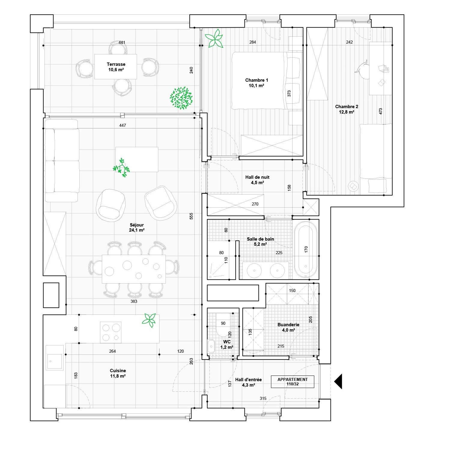 Appartements 110/22 et 110/21 : séjour "traversant", cuisine contemporaine, 3 chambres, salle de bain, salle de douche et... une superbe terrasse !